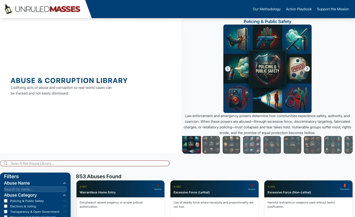 Every act of abuse we track is named and codified in a living Abuse & Corruption Library so it cannot be ignored or hand-waved away. Your donation fuels this library and links each abuse to dozens of concrete, non-violent responses. Action playbooks give options to ordinary citizens, workers, unions, judges, businesses, tenants, and many other groups — so that for every abuse, there is always something peaceful and effective that people can do about it.